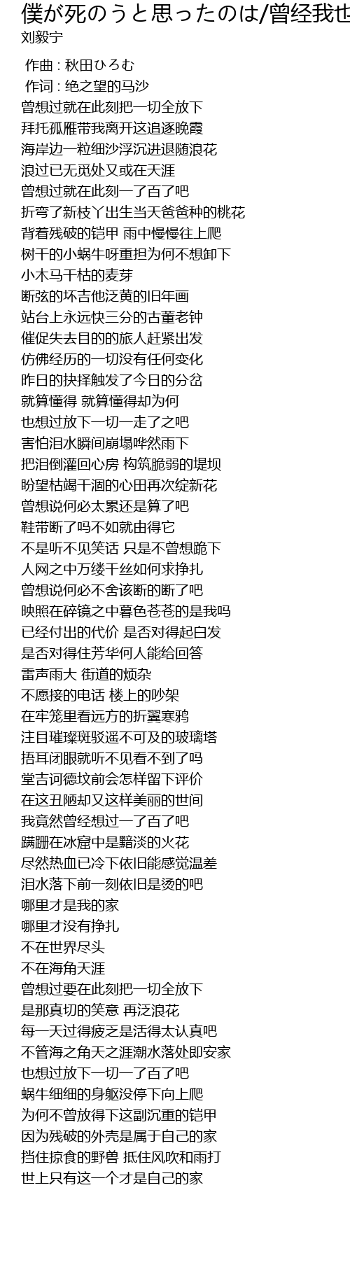 曾经我也想过一了百了是中岛美嘉演唱的歌曲由秋田弘填词谱曲收录于中岛美嘉于 2013 年 8 月 28 日发行的单曲曾经我也想过一了百了中. 這些歌詞用原始歌劇腔唱也許很 cheesy但用這種鹽嗓唱就變得充滿破碎美就是那種你不知道他的鹽臉背後有什麼故事但你知道一定絕對必須有個哀傷的故事 Read more 中日文歌詞飛機雲. 僕 ぼく が 死 し のうと 思 おも ったのは.
